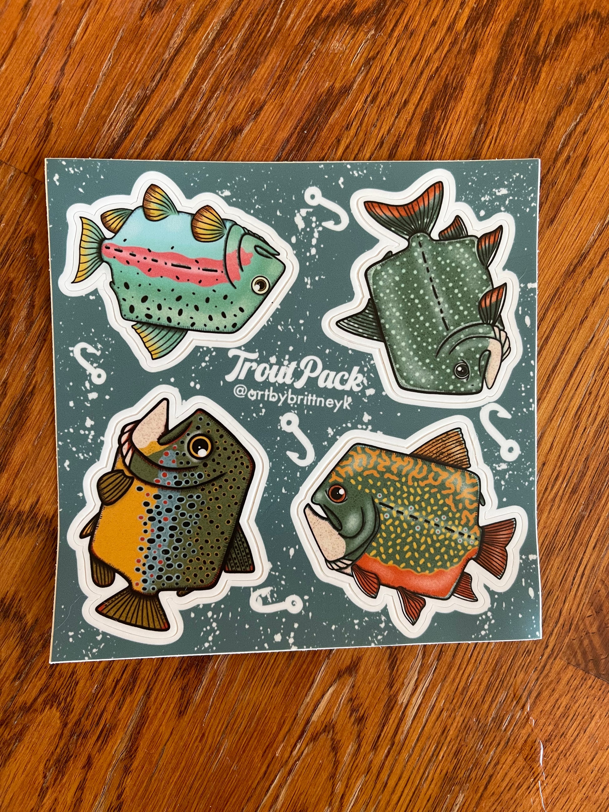 This is a limited-run sticker sheet that has 4 stickers about 2.5" including the rainbow trout, lake trout, brook trout, and brown trout. These are all waterproof and ready to go fishing with you!